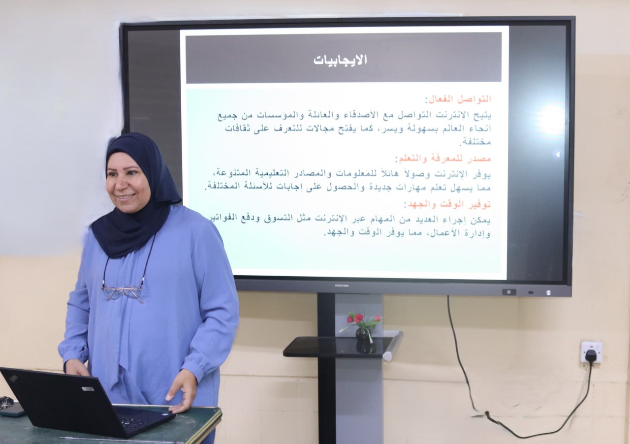 The College of Dentistry at the University of Baghdad, through its Committee for Coexistence and Community Peace, organized a scientific seminar entitled “The Internet: Between Advantages and Disadvantages.” The seminar was presented by Dr. Zainab Ali Salman and attended by a number of faculty members and staff.
