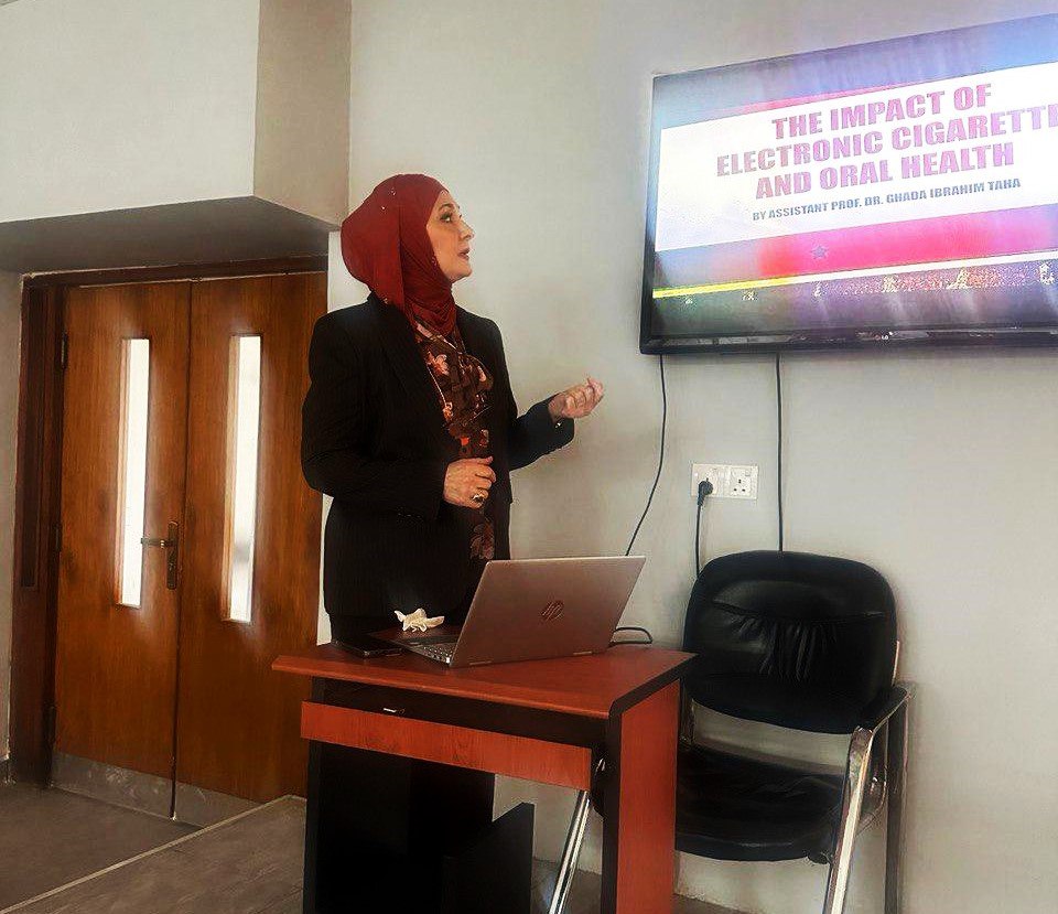 The College of Dentistry at the University of Baghdad, through its Rehabilitation, Employment, and Follow-up Unit, organized a workshop entitled “The Effects of E-Cigarettes on Tooth Decay.” The workshop was presented by Assistant Professor Dr. Ghada Ibrahim Taha and attended by a number of students from the college.