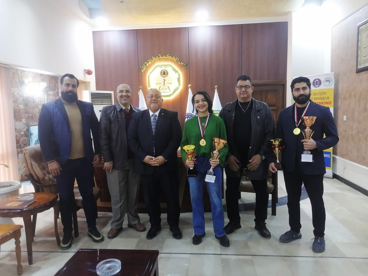 Under the patronage of the esteemed Dean of the College of Dentistry, Professor Dr. Raghad Abdul Razzaq Al-Hashemi, and in the presence of the Administrative Assistant Dean, Dr. Hussam Mohammed Saeed, along with the coaches of the Student Activities Unit, the College organized a celebration honouring the tennis team on the occasion of their second-place victory in the central championship of the University of Baghdad.