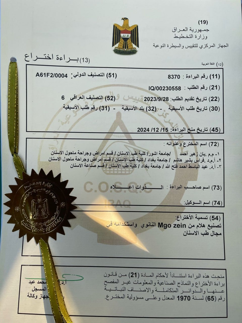 Researchers from the College of Dentistry at the University of Baghdad—Assistant Professor Dr. Firas Basheer Al-Tawil, Professor Dr. Abdul Basit Ahmed Fathallah, and Assistant Lecturer Ban Zuhair Ahmed—have been granted a patent by the Central Organization for Standardization and Quality Control as part of doctoral research, for successfully developing a new nanocomposite material.