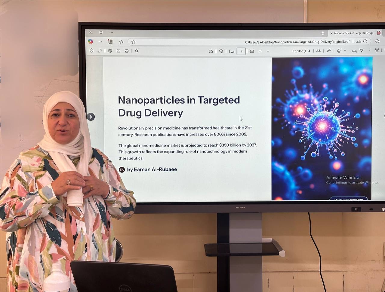 Under the patronage of the esteemed Dean of the College of Dentistry, Professor Dr. Raghad Abdul Razzaq Mohammed, the College of Dentistry at the University of Baghdad organized a scientific seminar entitled “The Use of Nanoparticles in Targeted Drug Delivery Systems”. The seminar was delivered by Prof. Dr. Iman Ali Al-Rubaie and attended by a number of faculty members.