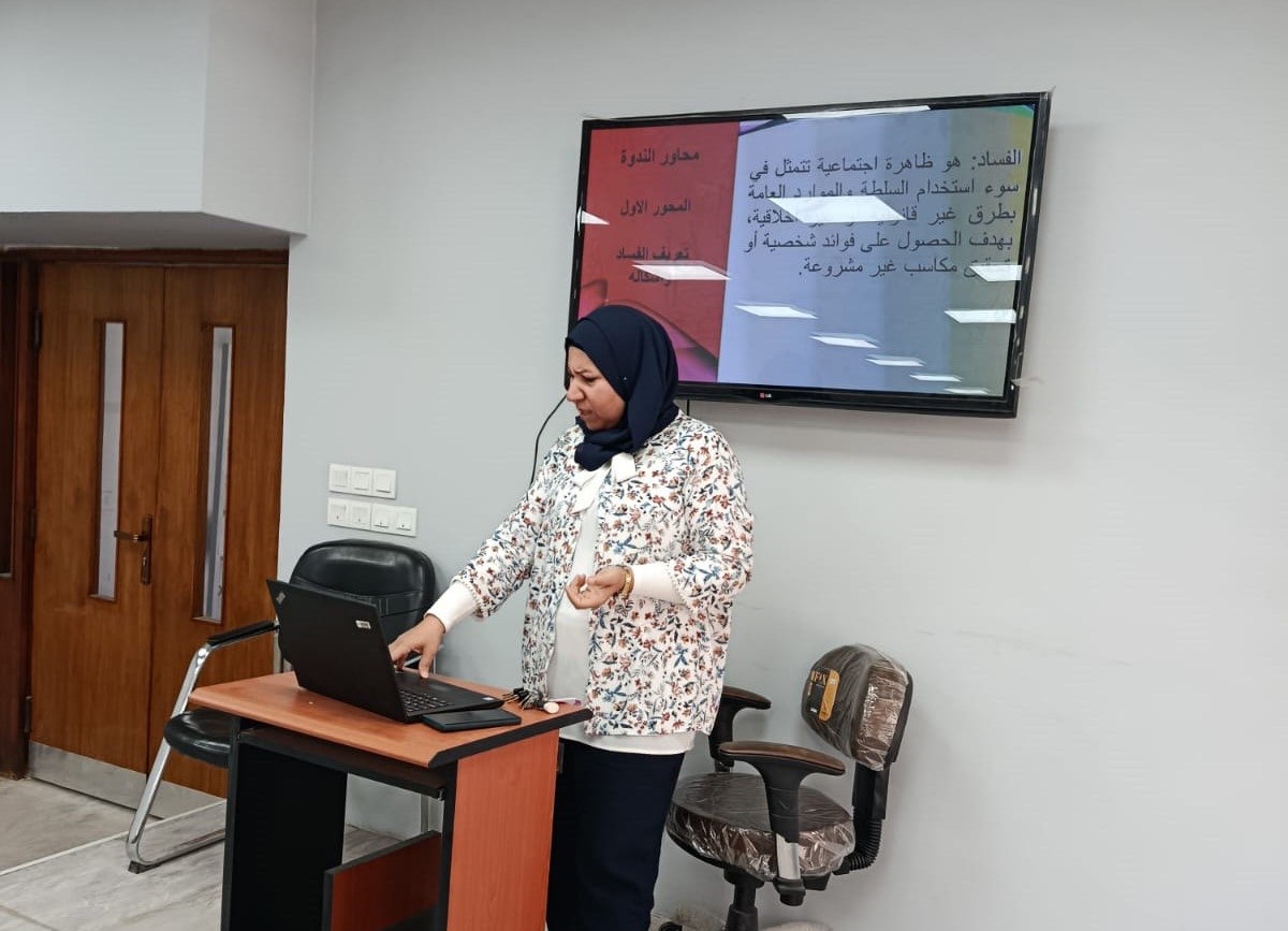 the College of Dentistry at the University of Baghdad — through the Media and Government Communication Division, in cooperation with the Department of Basic Sciences — organized a scientific symposium entitled “Combating Corruption as a Basis for Achieving Integrity in Society.” The lecture was delivered by Assistant Professor Dr. Zainab Ali Salman, with the attendance of several college staff members.
