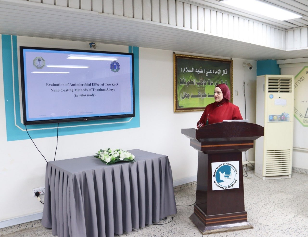 The College of Dentistry at the University of Baghdad organized a scientific symposium entitled “The Antimicrobial Effect of Zinc Oxide Nanoparticles as a Coating Material for Fixed Orthodontic Retainers.” The lecture was delivered by Professor Dr. Shahbaa Abdul‑Ghafour, with the attendance of several faculty members and postgraduate students.