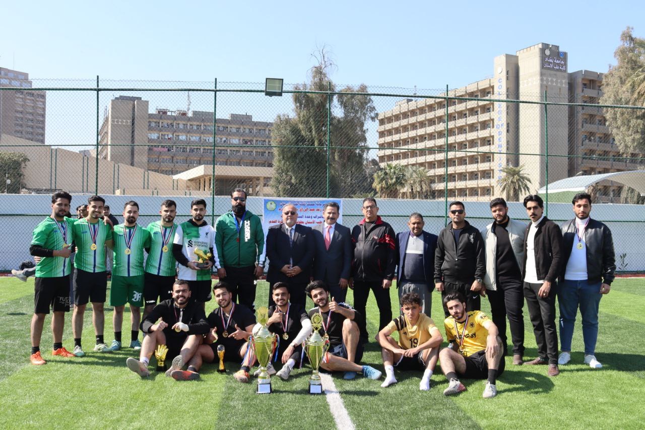 Under the patronage of the Dean of the College of Dentistry, Professor Dr. Raghad Abdul-Razzaq Al-Hashemi, and the supervision of the Student Activities Unit, the college concluded its five-a-side football tournament for undergraduate students with the final match between the fifth-year and third-year teams. The match was held on the college’s field amidst enthusiastic student support.