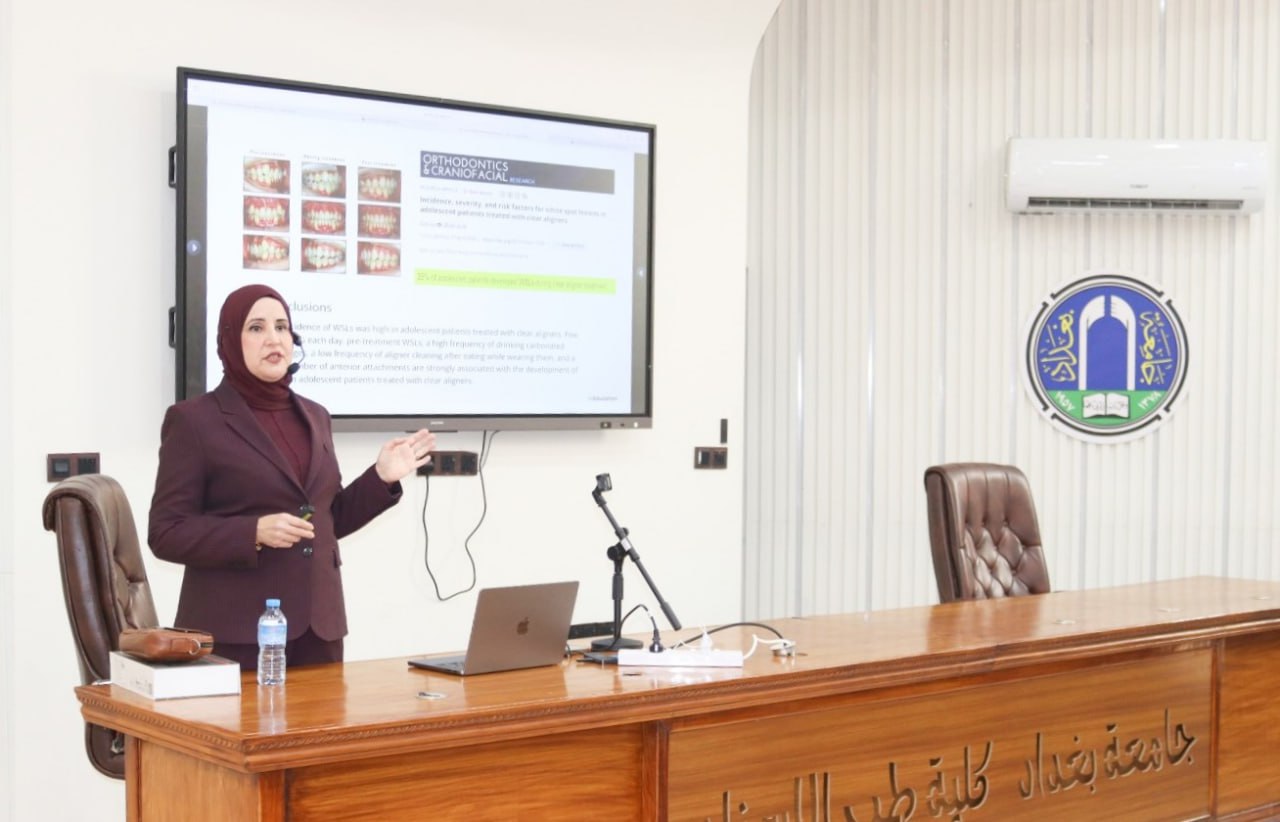 . Under the patronage of the Dean of the College of Dentistry, Professor Dr. Raghad Abdul-Razzaq Mohammed, the event was held. The lecture, delivered by Assistant Professor Dr. Ban Ghanem from Al-Mustansiriya University, was attended by postgraduate students in the Orthodontics Department.