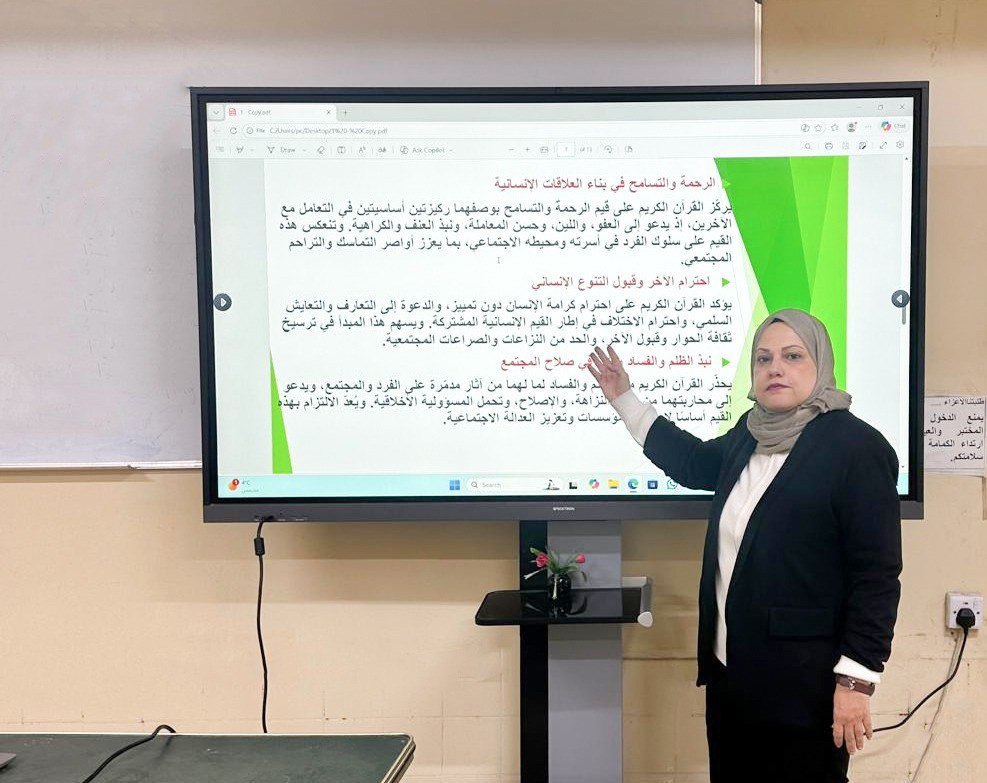 Under the patronage of the Dean of the College of Dentistry, Professor Dr. Raghad Abdul-Razzaq Mohammed, the College of Dentistry at the University of Baghdad – Department of Media and Government Communication, organized a seminar entitled “The Holy Quran and the Development of the Individual and Society within the Framework of Islamic Values and Identity” on the occasion of National Quran Day. The seminar was presented by Assistant Professor Dr. Maha Faisal Ahmed and attended by a number of students and staff members of the college.