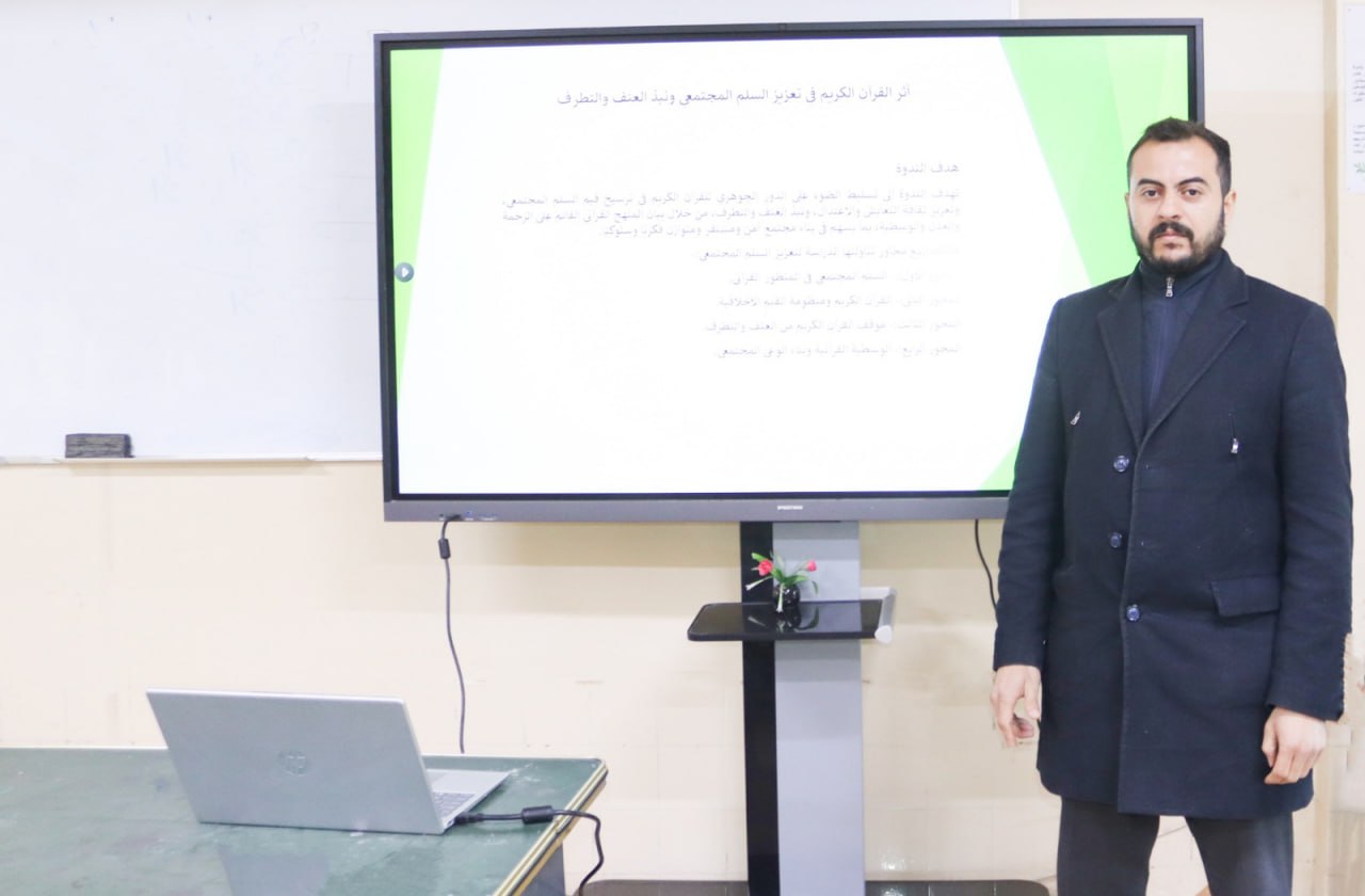 The College of Dentistry at the University of Baghdad – Media and Government Communication Division, in cooperation with the Basic Sciences Branch, organized a seminar entitled “The Impact of the Holy Quran on Promoting Social Peace and Rejecting Violence and Extremism” on the occasion of National Quran Day. The seminar was presented by Dr. Zainab Ali Salman and Mr. Bahaa Al-Din Salah Fadhil, and was attended by a number of students from the college.